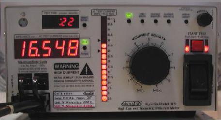 Hypatia high current sourcing milliohm meters address your requirements for ground system testing through every phase of your product's life. They provide the high AC test current, impedance measurement range and precision necessary to meet the verification requirements of safety certification agencies. In addition, the Model 309 is computer network capable. And since its network interface is card slot based, it's able to easily accommodate changing network technologies. For manufacturing environments, the Model 309 additionally provides front panel automation and virtual instrument features to make repetitive testing simple and efficient. This instrument is straightforward to use, rugged, reliable, well supported with a two year full service warranty, and designed to meet or exceed UL 3111. (However, as of 1 January 2008 this instrument is no longer listed to UL 3111 by ETL. The design, construction, testing, and calibration of the instrument has not changed, but rather Hypatia no longer maintains the ETL certification service due to the high costs of the service relative to the sales volume of this instrument. Please contact Hypatia Inc.if you have questions or concerns about this aspect of the instrument.) In addition, it offers state of the art design which achieves precision without hardware adjustments. The annual performance verification or software calibration, provided in the owner's manual, is a straightforward closed case procedure. All instruments include an NIST traceable certificate indicating the results of performance verification using equipment and procedures meeting the requirements of MIL-STD-45662A. This certificate includes a listing of actual test data to address your ISO 9000 requirements.